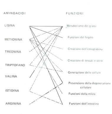 Abbiamo già conosciuto precedentemente (il riferimento è ad incontri e seminari di studio - n.d.R.) quali e quanti sono gli aminoacidi essenziali e riportiamo qui una esauriente tabella.